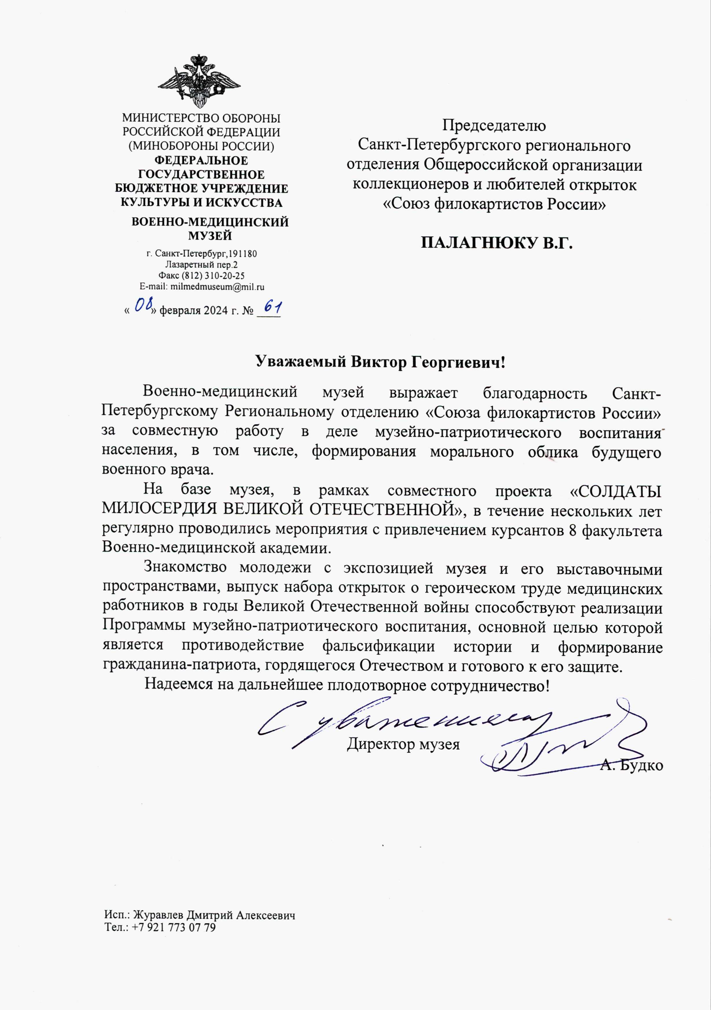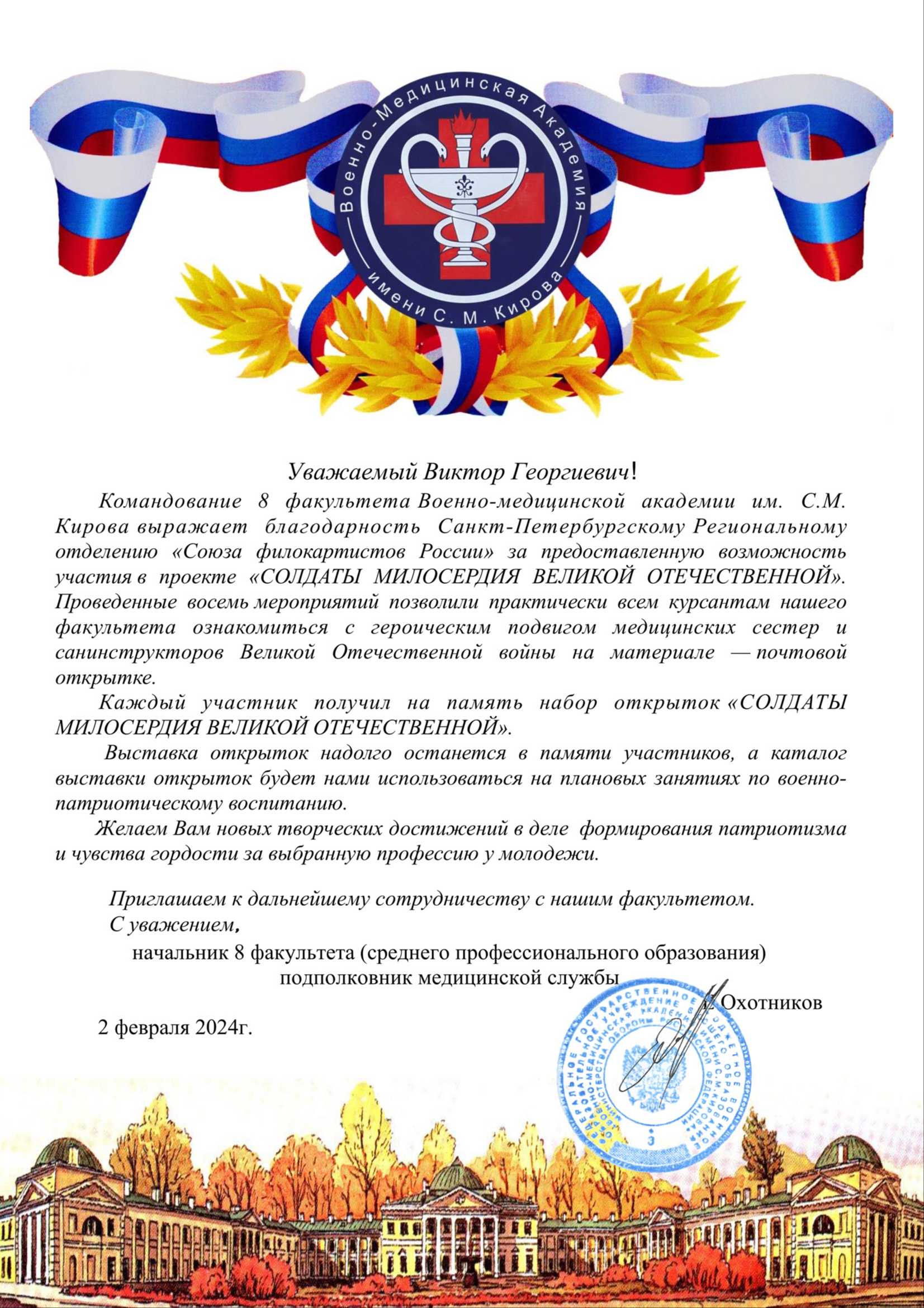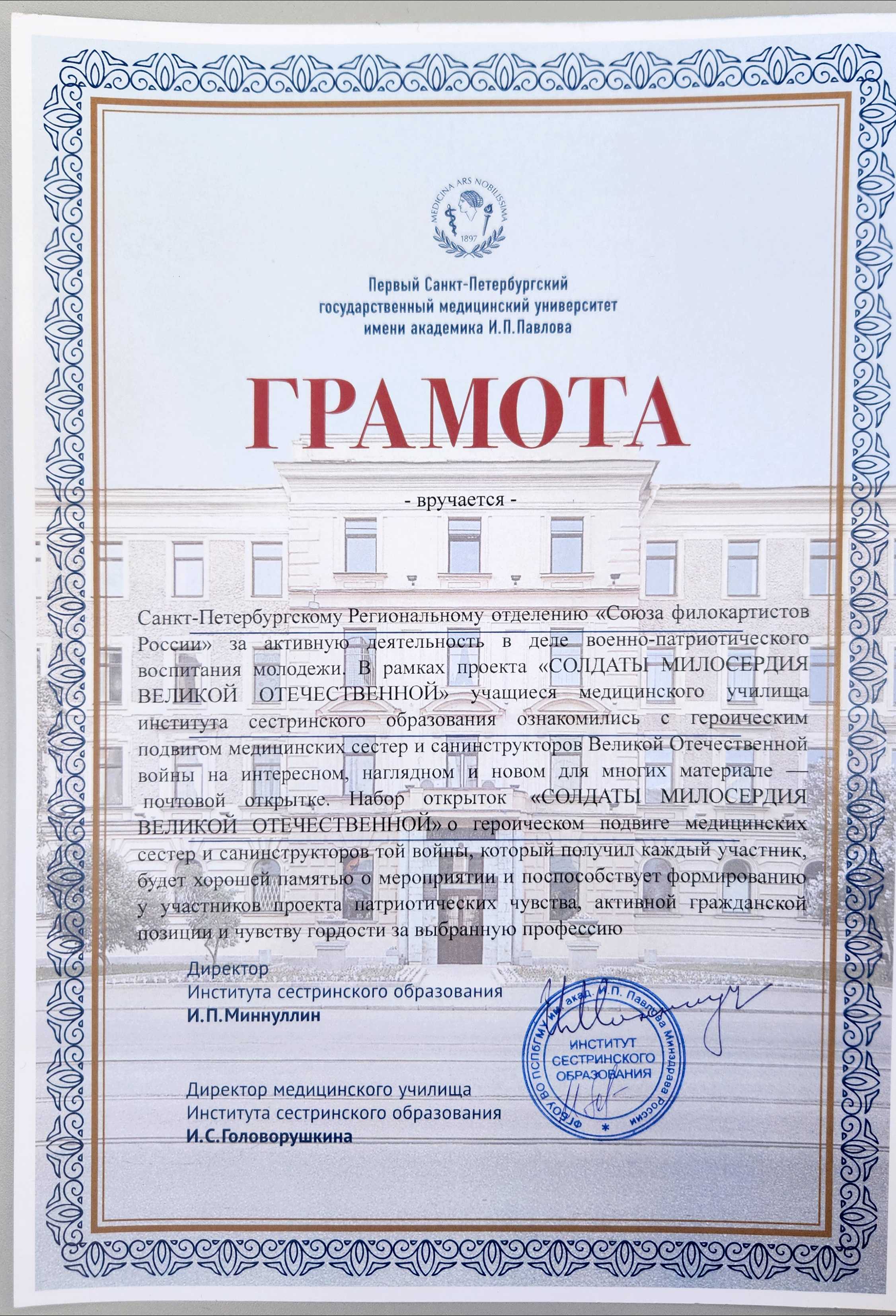 27 апреля 2023 года в соответствии с Планом Проекта Санкт-Петербургского Регионального отделения «Союза филокартистов России» — «Солдаты МИЛОСЕРДИЯ ВЕЛИКОЙ ОТЕЧЕСТВЕННОЙ», получившего поддержку Фонда президентских грантов, проведено первое мероприятие в Военно-медицинском музее.