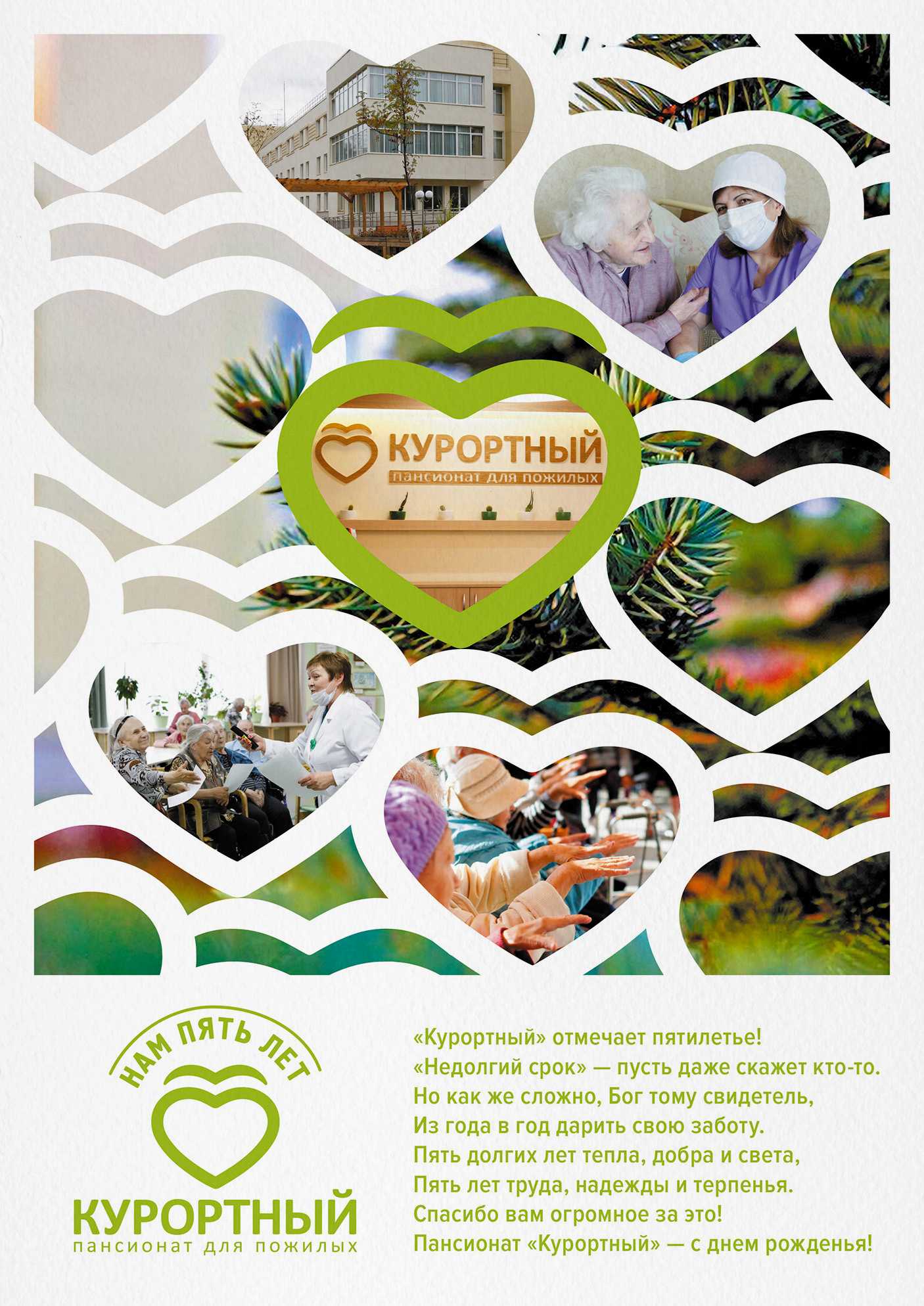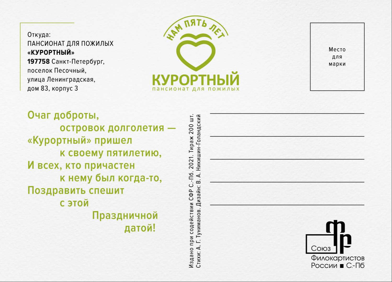 К пятилетию пансионата для пожилых «Курортный» в декабре 2021 года состоялся выпуск имиджевых открыток. В поддержку был подготовлен широкоформатный плакат. Открытки и плакат сопровождались стихами.