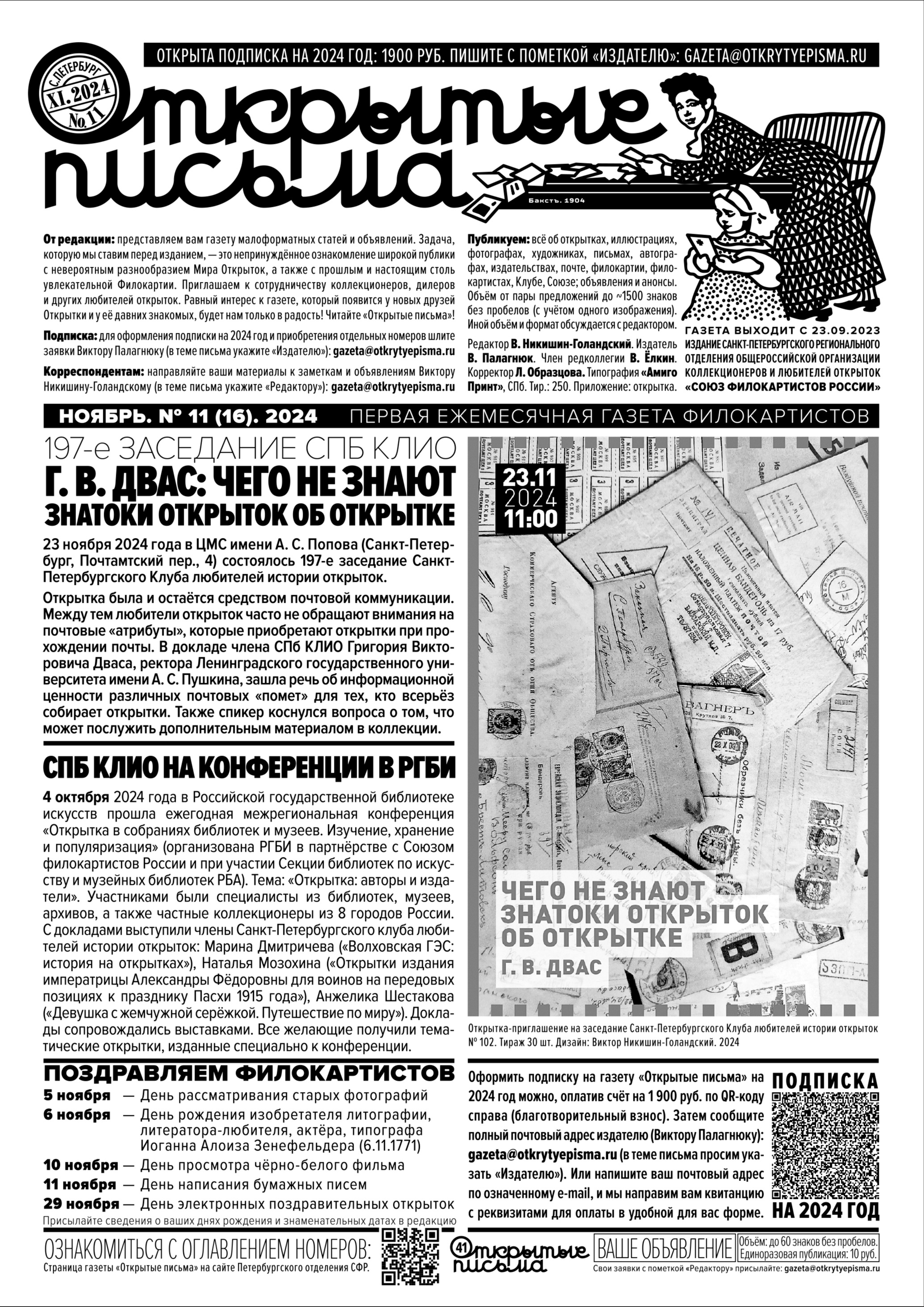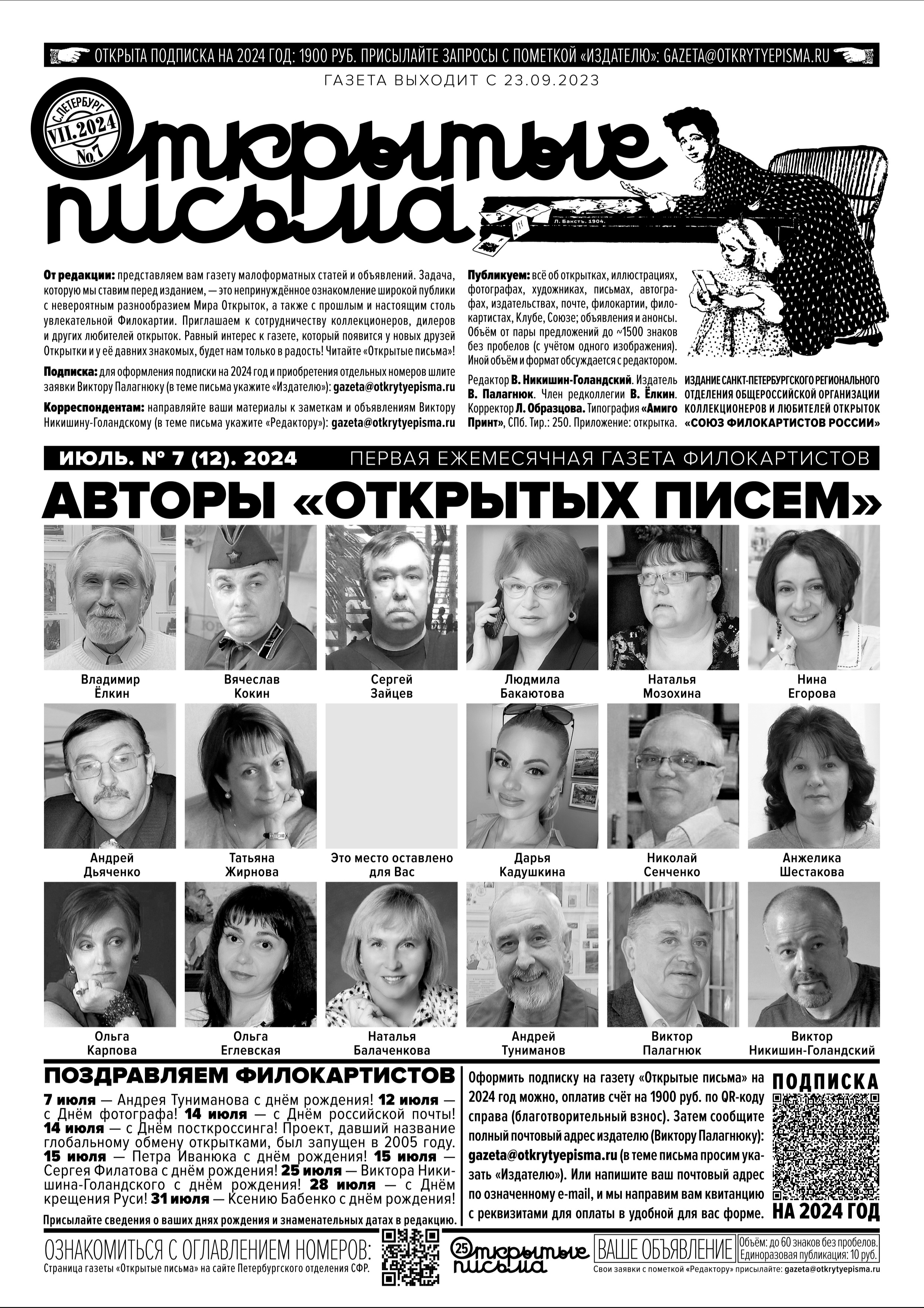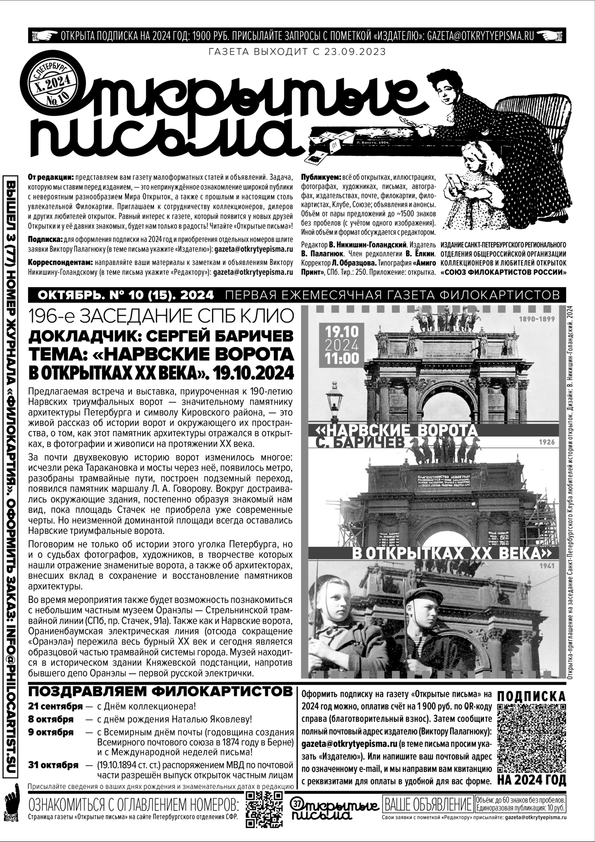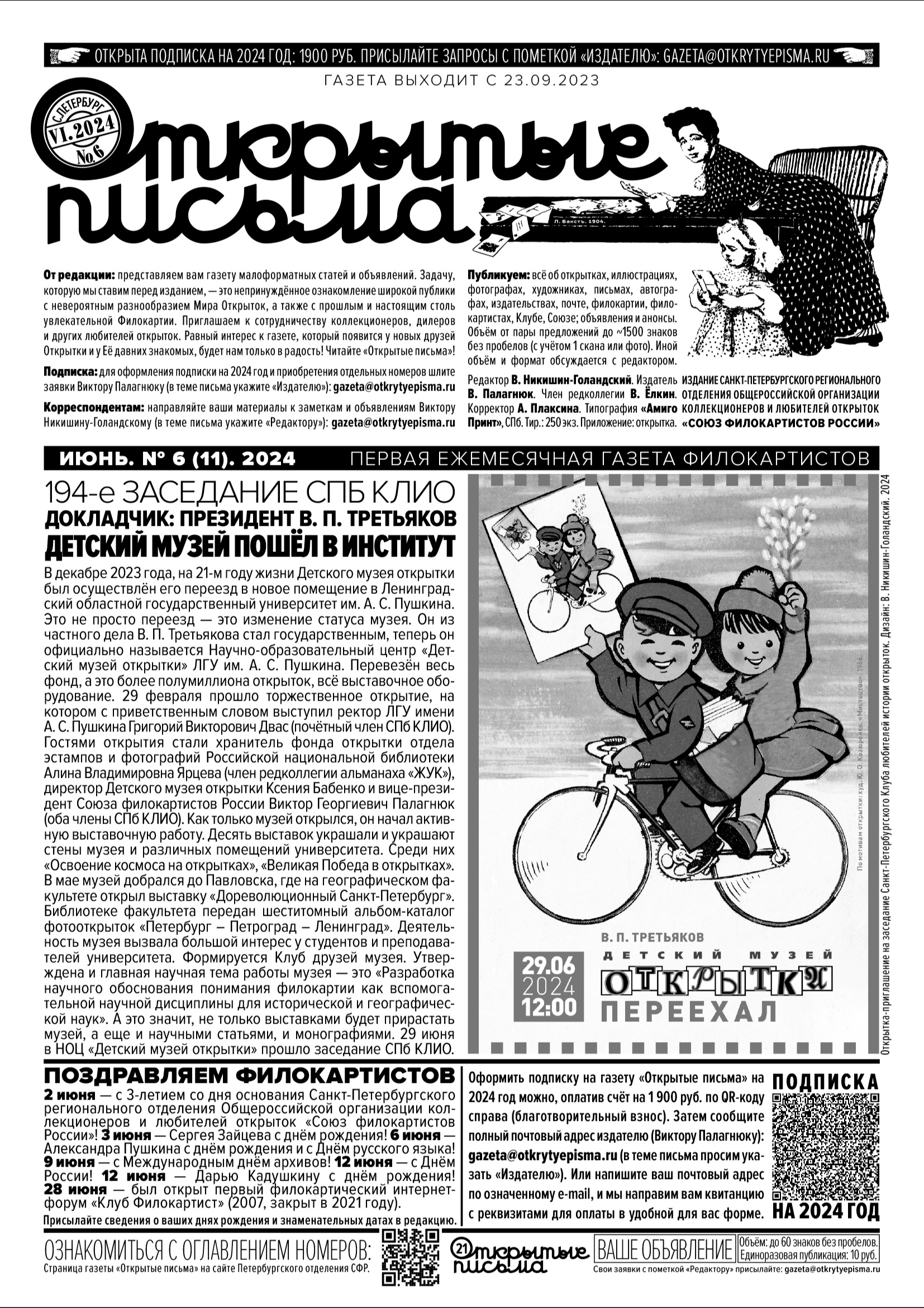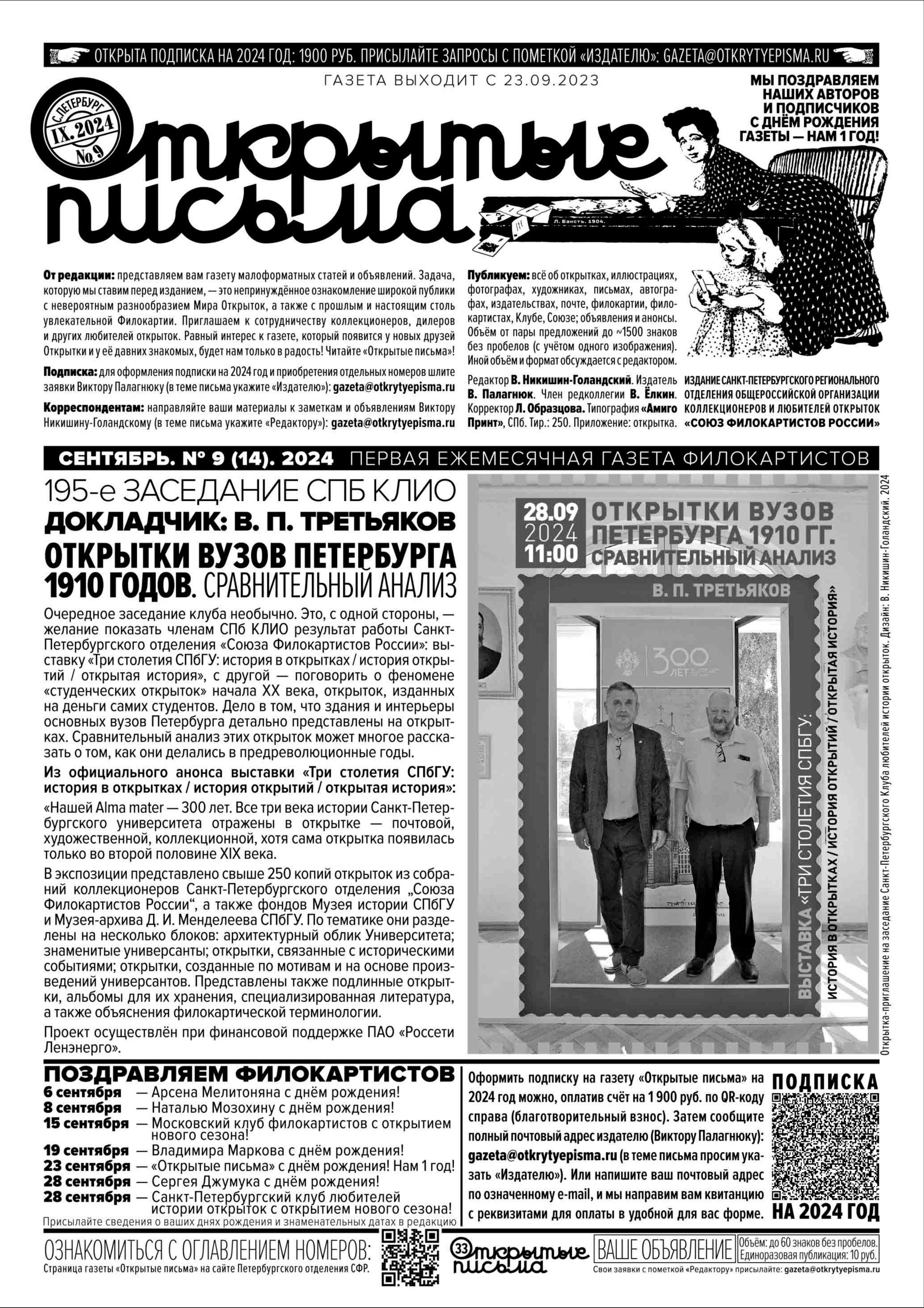 23 сентября 2023 года вышел в свет первый номер газеты «Открытые письма» — издания Петербургского отделения «Союза филокартистов России».