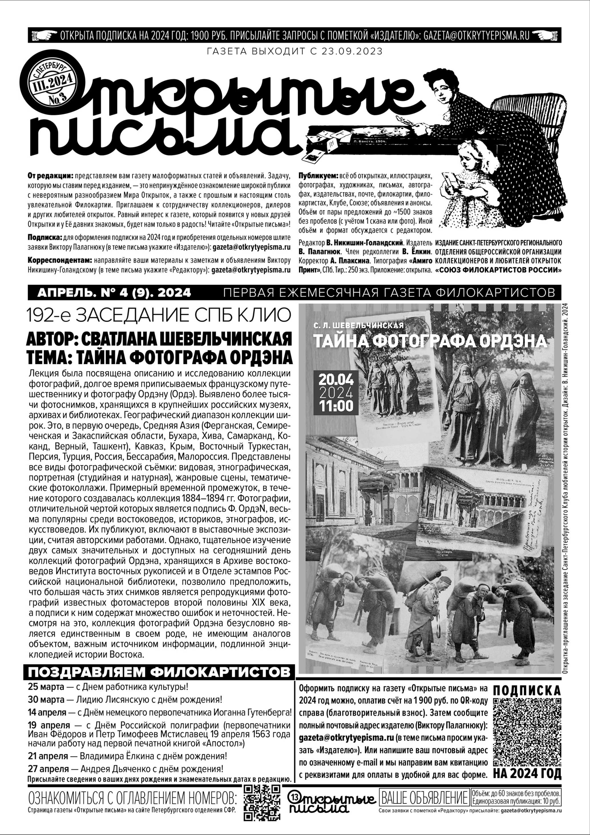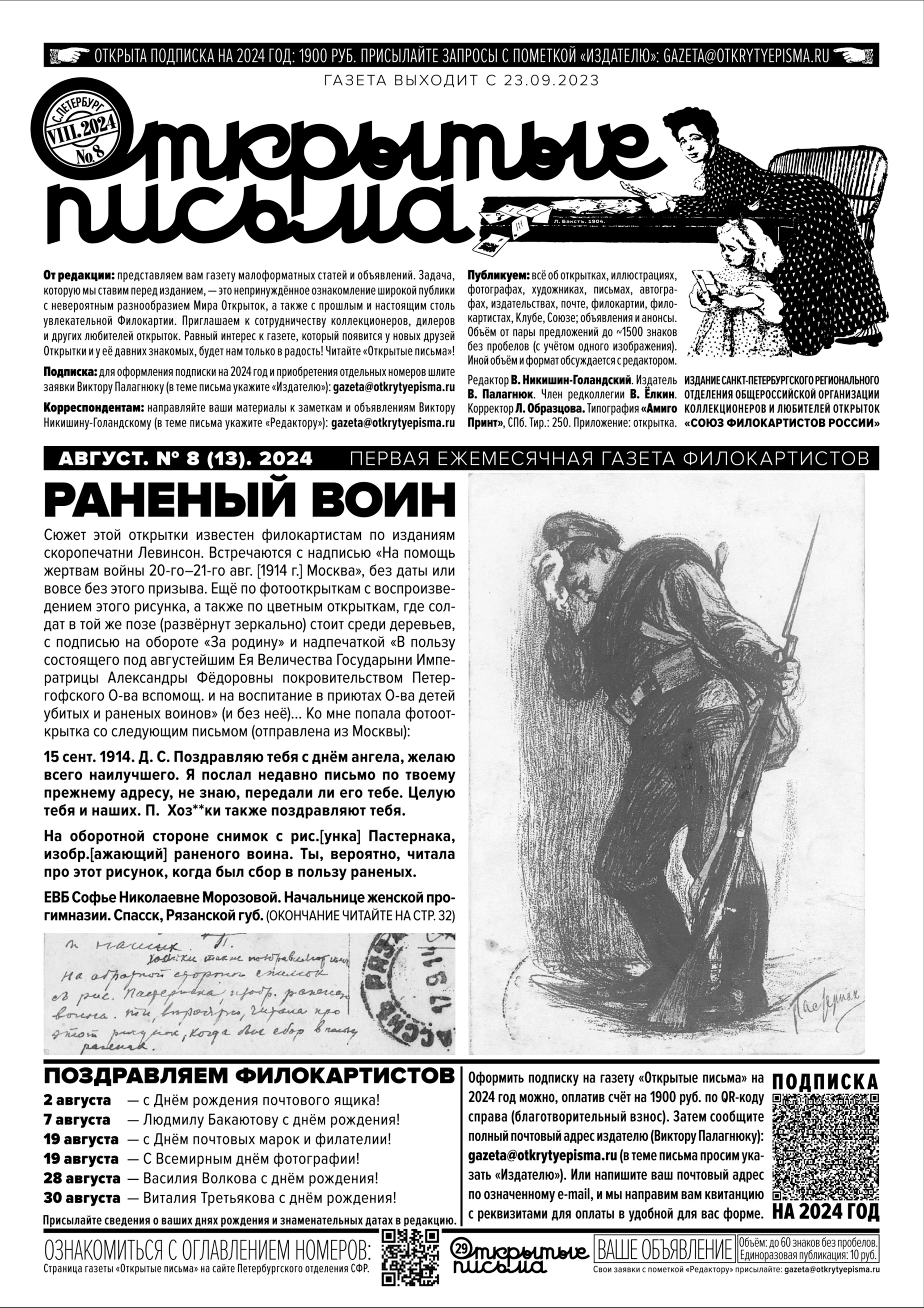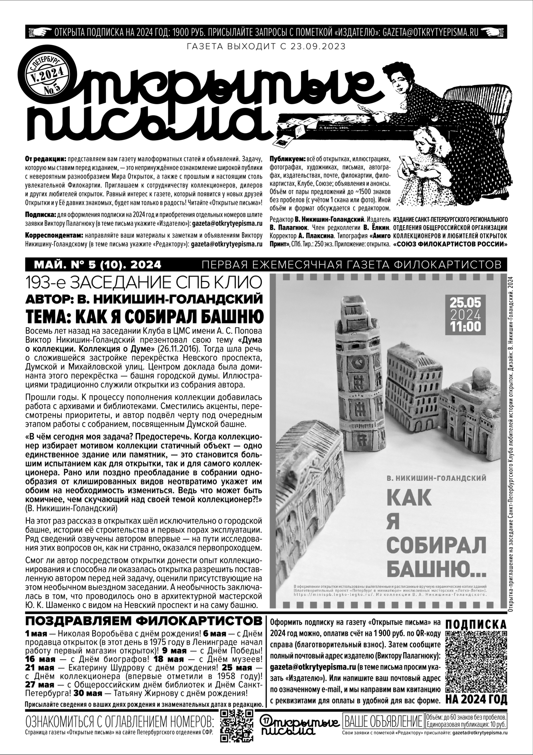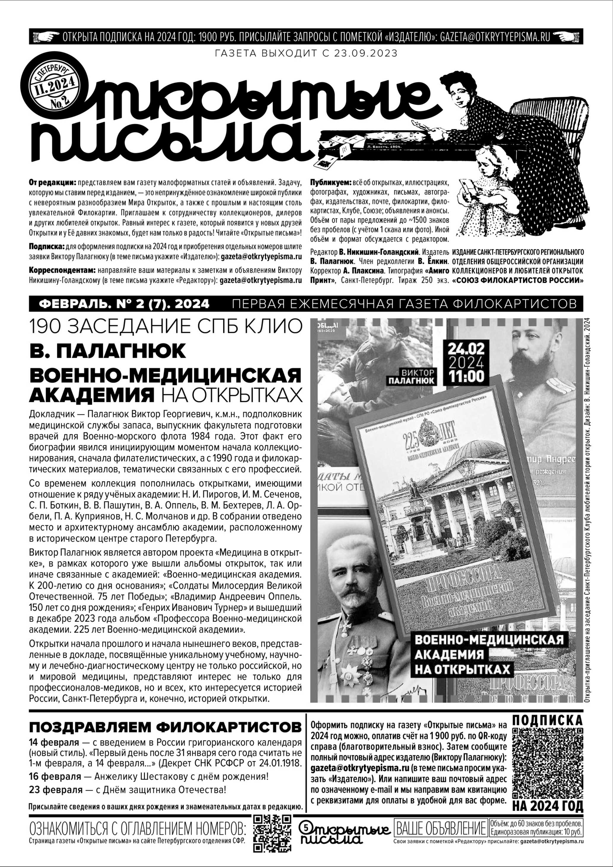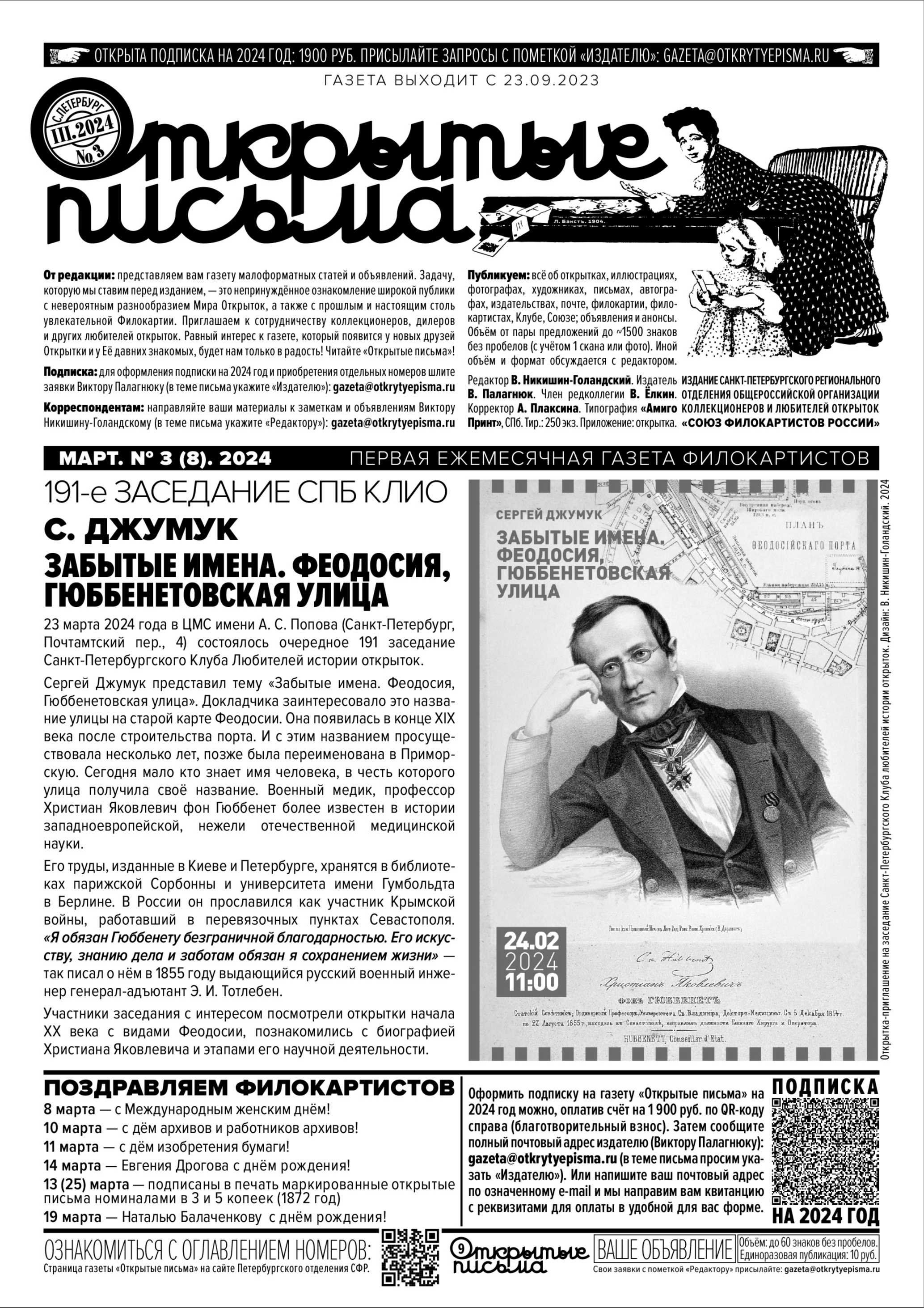23 сентября 2023 года вышел в свет первый номер газеты «Открытые письма» — издания Петербургского отделения «Союза филокартистов России».