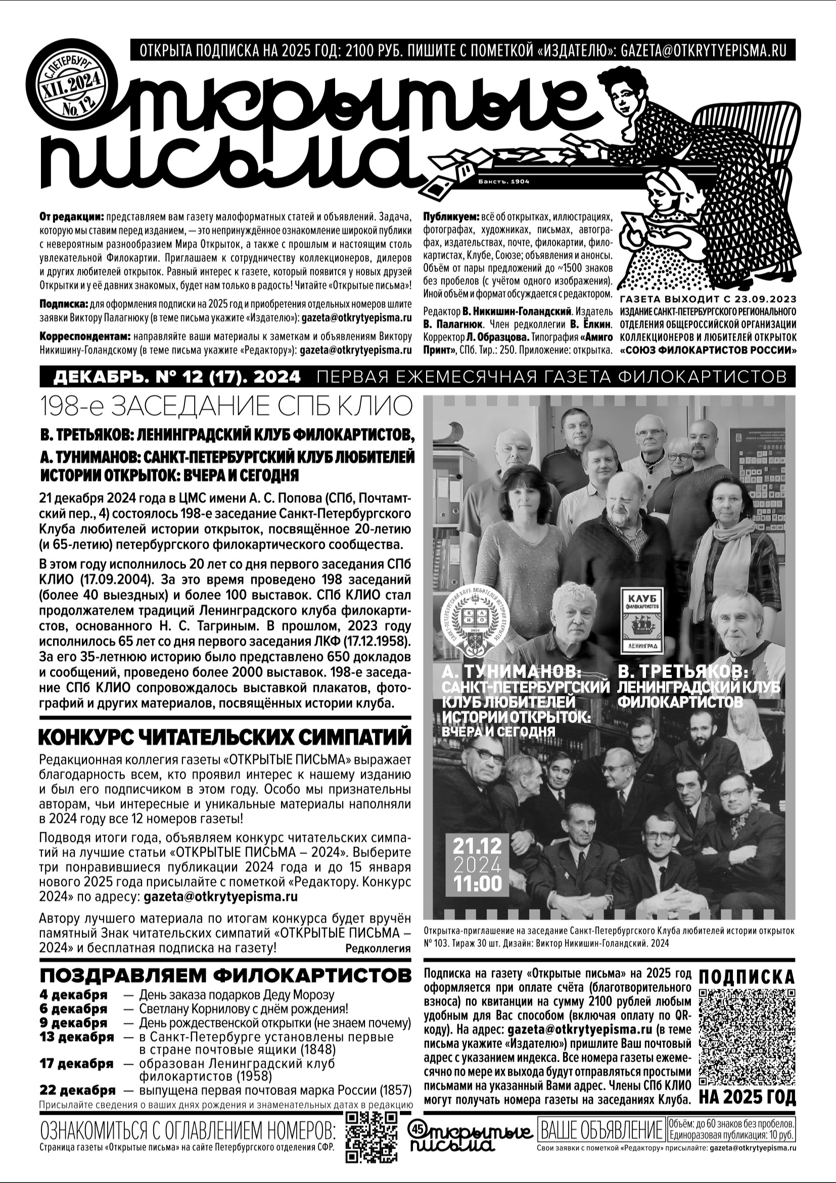 В. Третьяков: ЛЕНИНГРАДСКИЙ КЛУБ ФИЛОКАРТИСТОВ. А. Туниманов: САНКТ-ПЕТЕРБУРГСКИЙ КЛУБ ЛЮБИТЕЛЕЙ ИСТОРИИ ОТКРЫТОК: ВЧЕРА И СЕГОДНЯ. 198 заседание СПБ КЛИО