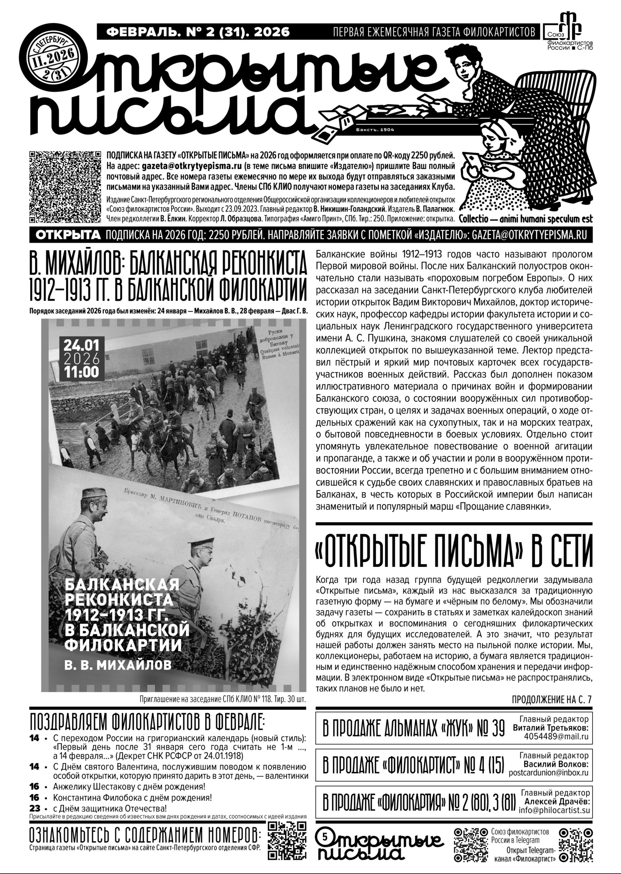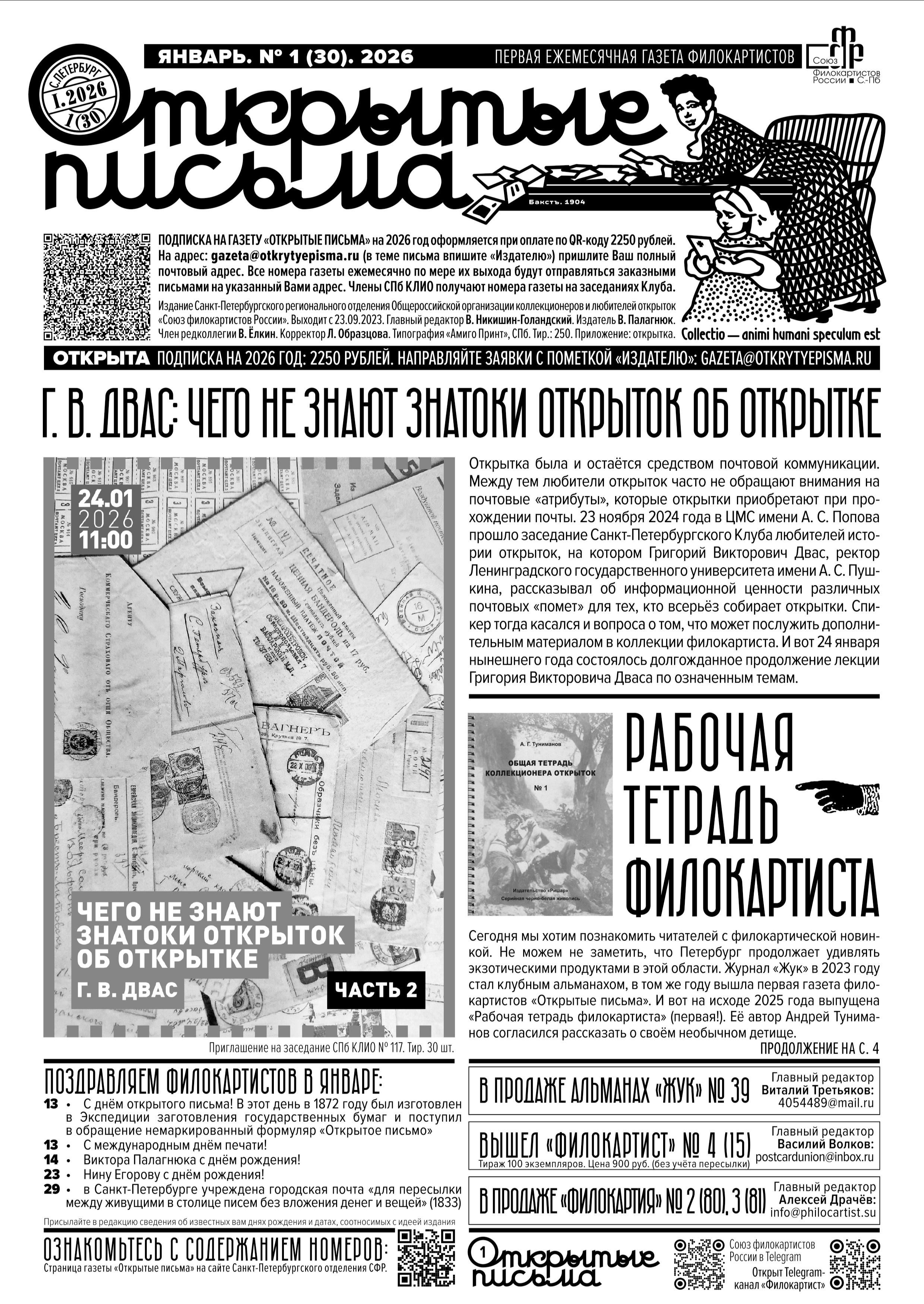 23 сентября 2023 года вышел в свет первый номер газеты «Открытые письма» — издания Петербургского отделения «Союза филокартистов России».